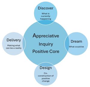Appreciative inquiry is a positivity-based research approach utilised in implementing changes in organisations or systems, whereby researchers conduct a positivity-based exploration of future possibilities or improvements (Hung et al., 2018; Trajkovski et al., 2013). Using appreciative inquiry to focus on organisational leadership as a collective, rather than the behaviours of individual leaders, enables blame-free exploration of an organisation’s success so that challenges are permitted (Schall et al., 2004; Trajkovski et al., 2013). Elements of the appreciative inquiry model shown in Figure 2 were incorporated into the interview guide, with interview questions presented using a positivity-based exploration to support participant positivity and engagement in the organisational change process (Hung et al., 2018).