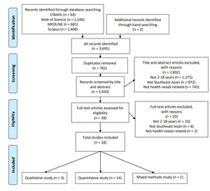 A preliminary review identified knowledge gaps and informed the research question: “What are the health needs of Southeast Asian migrant children in their host country?” Health needs in this context are broadly described as health risks or unique strengths related to child health. The inclusion and exclusion criteria are provided in Table 1.